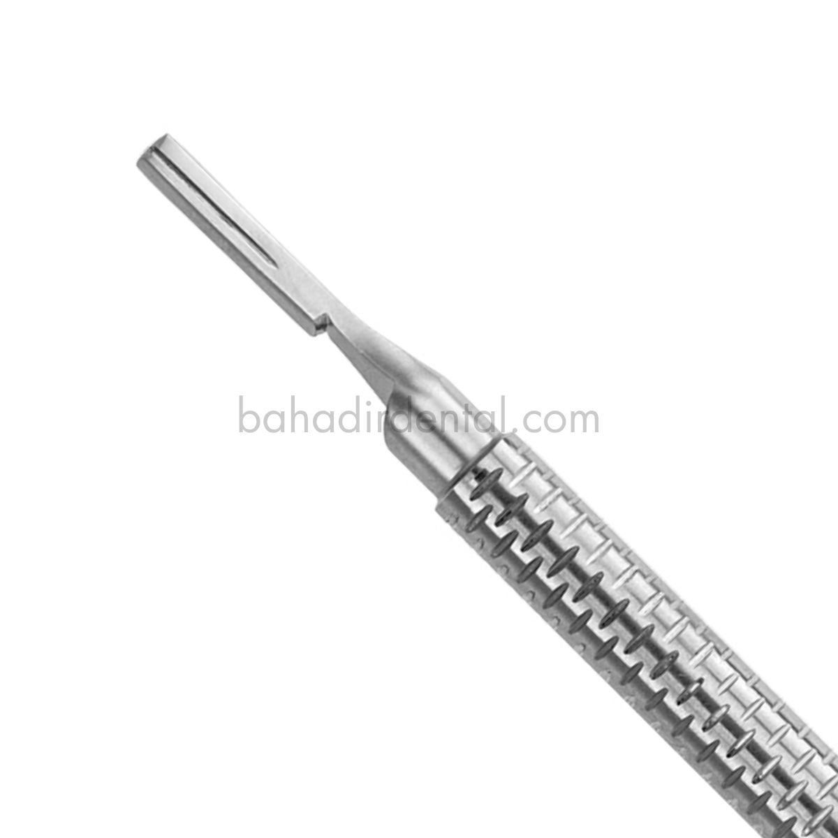 Bistüri Sapı - Açılı, cerrahi ve dental prosedürlerde çeşitli bistüri uçlarını tutmak ve yönlendirmek için kullanılır. Özellikle, cerrahi alanlarda zorlu açılarda çalışırken veya dar alanlarda hassas kesimler yaparken tercih edilir. Bu sap, çeşitli cerrahi uygulamalarda ve diş hekimliğinde yüksek hassasiyet ve kontrol sağlar, 10, 11, 12, 12D, 13, 15 ve 15C numaralı bistüri uçları ile uyumludur.