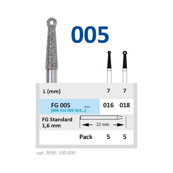 FG 005 Diatrepano elmas frez, özellikle erişimi zor bölgelerde kavite açma ve derinleştirme işlemleri için tasarlanmıştır. Dayanıklı elmas kaplaması sayesinde hassas ve kontrollü kesim imkânı sunar. Klinik ve laboratuvar uygulamalarında tercih edilen güvenilir bir frezdir.
